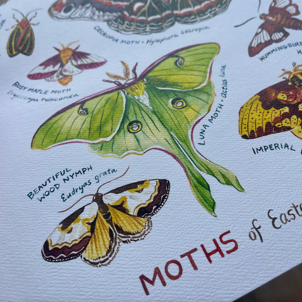 Celebrate our nocturnal neighbors with my detailed watercolor art print that features 10 beautiful species of moths that are native to eastern North America.