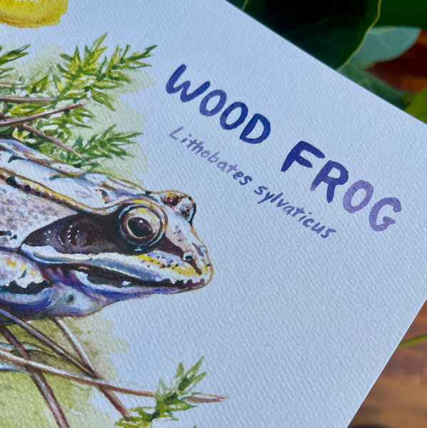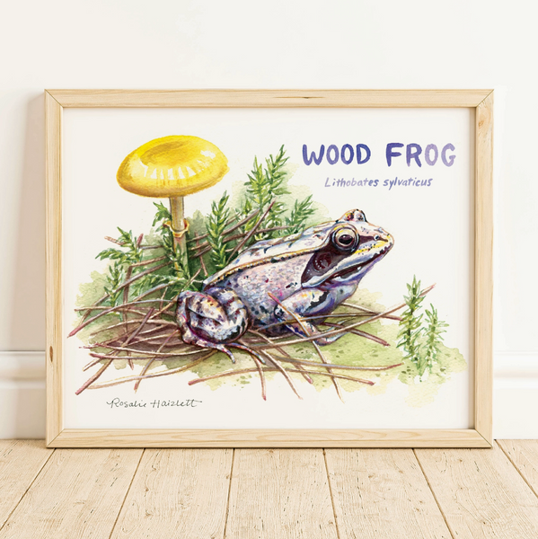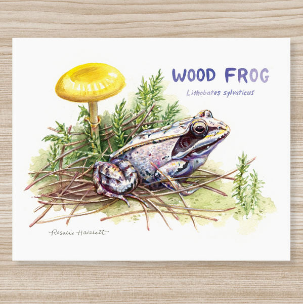 This art print is a reproduction of my original watercolor painting. It features a wood frog next to some bright yellow mushrooms. This frog is a common forest friend throughout much of the United States.