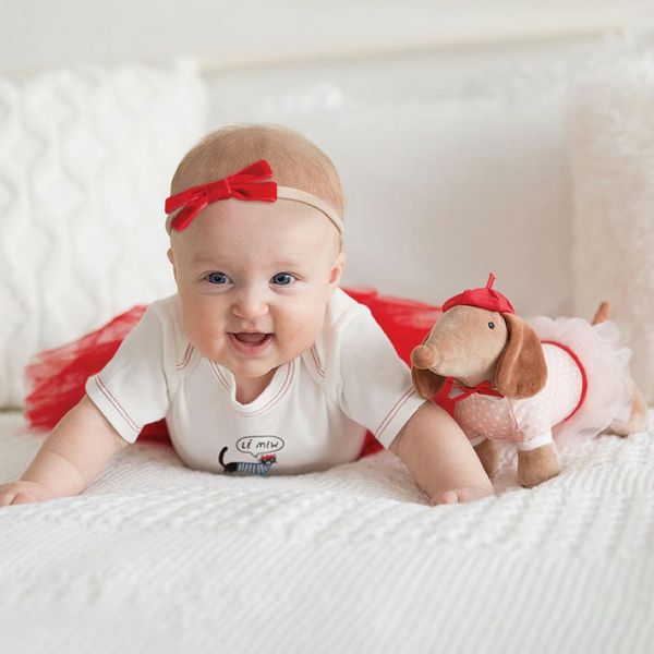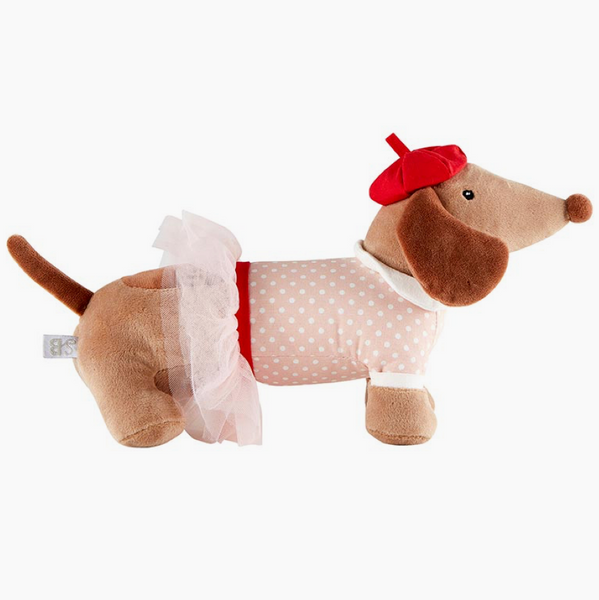 This stylish plush puppy exudes a French flair with cuddly soft materials, an adorable polka dot tutu dress and red beret.
