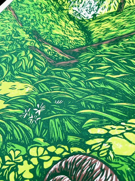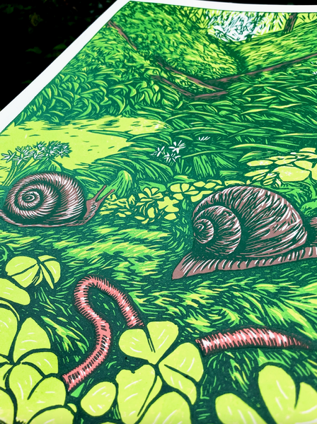 This four color, 11" x 17” linocut print of a snapshot of a lush, green forest with snails and a worm was designed and made by Augury Press in Portland, Oregon.