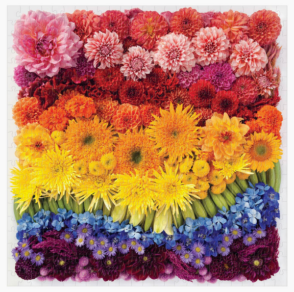 Galison's Flowers 500 Piece Puzzle features an array of flowers and petals placed in a mesmerizing rainbow of color. The beautiful photo is by Julie Seabrook Ream of Hey Jules Studio.