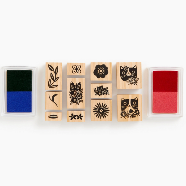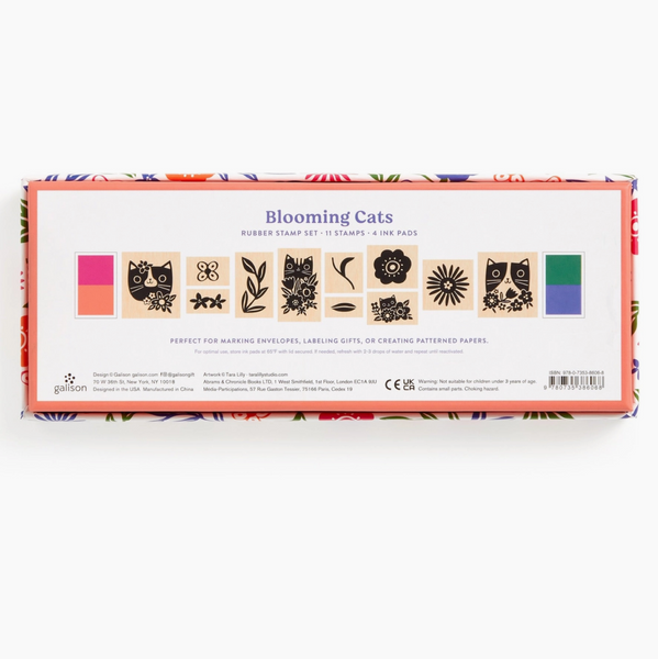The Blooming Cats Rubber Stamp Set features 11 beechwood-handled rubber stamps and 4 ink colors packaged in a sturdy box. Create endless multi-colored floral and cat combinations, perfect for crafty gifts, custom notes, gift wrap, or decorations! Unleash your inner artist!