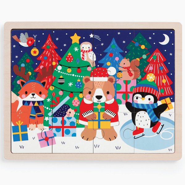 This cheerful puzzle features adorable holiday characters that bring seasonal joy to playtime. Little hands will love fitting each chunky wooden piece into the sturdy tray, building fine motor skills while giggling at the merry scene.