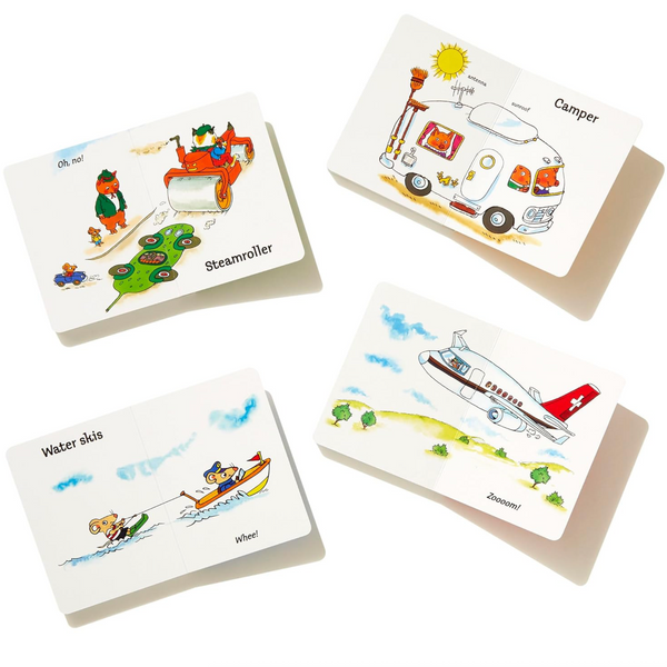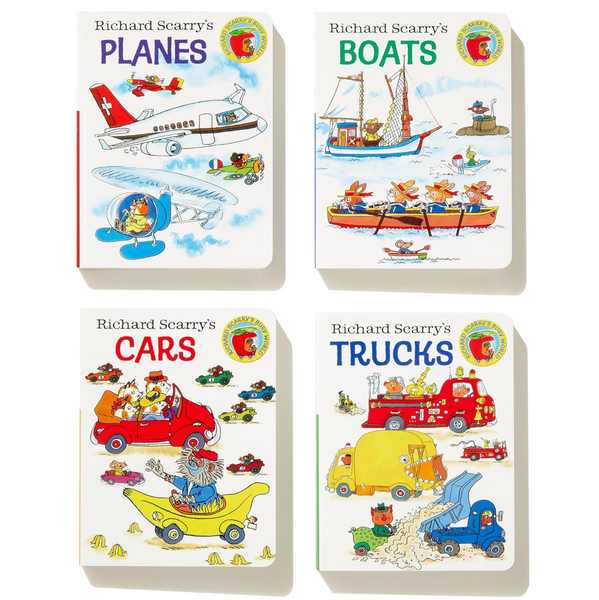 A collection of four Richard Scarry mini board books that bring children behind the wheel of their favorite vehicles. This adorable boxed set with a handle is perfect for little ones on the go!