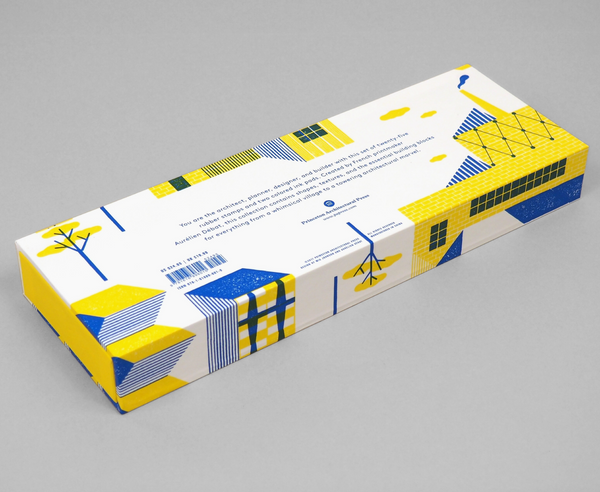 The matchbox-style box contains twenty-five wood backed stamps in an assortment of shapes and textures, all the essential building blocks needed to create a simple house, a whimsical village, or a towering architectural marvel—the combinations are infinite and immediately gratifying.