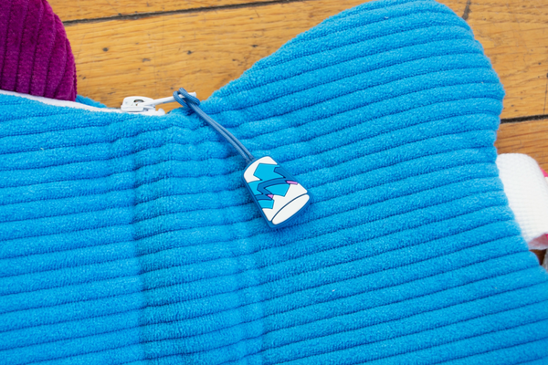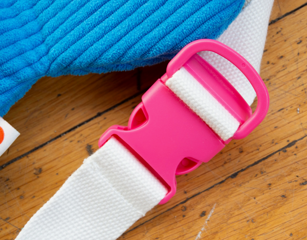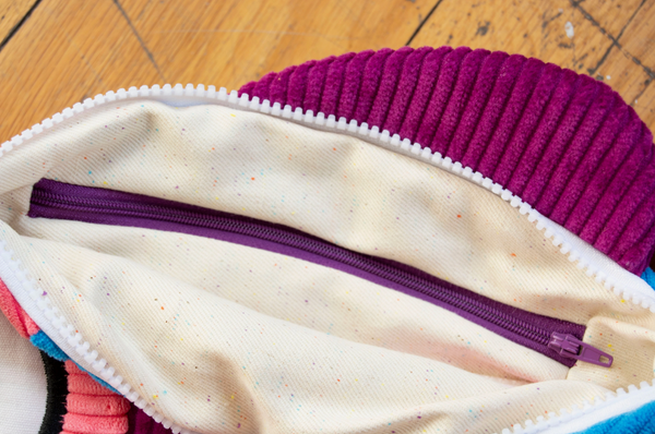 He can be worn as a crossbody or a (large) fanny pack. The interior is lined with a durable cream-colored cotton canvas tastefully flecked with multicolored 'funfetti sprinkles'. The large main pocket extends the entire length of the fish and is big enough for a standard sized water bottle, Nintendo Switch, or small journal. A smaller interior pocket is great for your wallet, phone, or your pencils and pens.