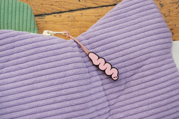 He's 17" x 6.75" and comes with a fruity little rubber worm zipper pull, D-ring and buckle matched to the adjustable 1.5" wide cotton strap, and can be adjusted to be between ~36" - 80" long (91cm x 203cm) (including the length of the bag) with the included strap-extender.