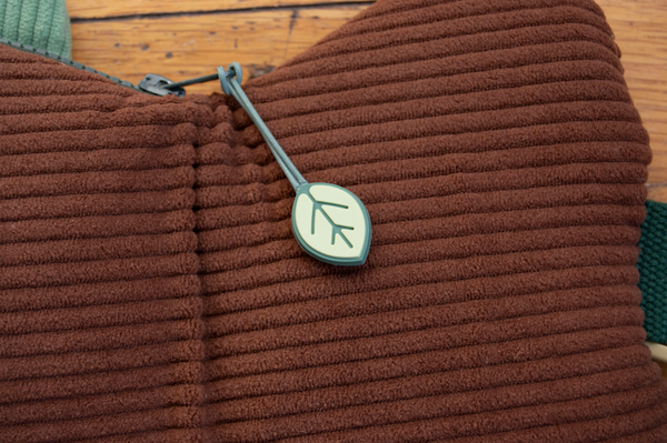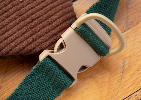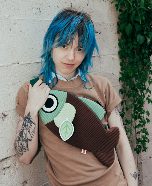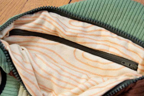 He can be worn as a crossbody or a (large) fanny pack. The interior is lined with a durable cream-colored cotton canvas tastefully printed with a woodsy texture. The large main pocket extends the entire length of the fish and is big enough for a standard sized water bottle, Nintendo Switch, or small journal. A smaller interior pocket is great for your wallet, phone, or your pencils and pens.