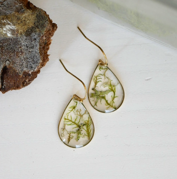 These sweet little teardrop dangles feature a variety of moss specimens for a beautiful layering of colors and textures.