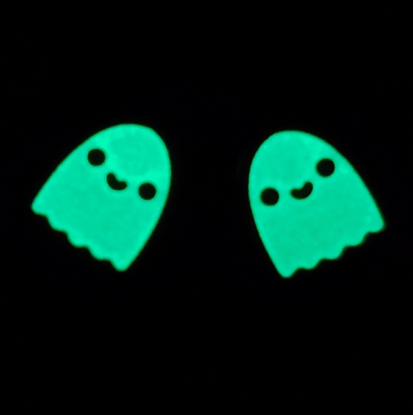 These earrings feature a tiny white ghost with a smiling face and little legs underneath.