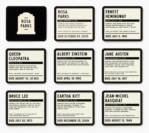 In this hilarious social game, players compete by putting their random celebrity and historical figure knowledge to the test–while trying to remember what year people died (or if they even have). When did Albert Einstein pass away? 1897? 1986? Don’t worry, we’ll provide a series of clever clues to help inform your guess–and the closest scores points.