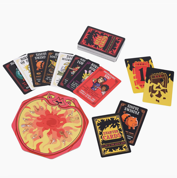 Use your Actions to trick, disrupt, and outwit the others, and ultimately watch their Tickets burn while yours stay nice and cool. If someone tries to drag you down, use your Defenses to fend off their attack. If you commit a Mortal Sin, like ghosting your mom or not replacing the toilet paper, then you’d better hope for some Divine Intervention to stay in the game. But if you commit an Unforgivable Sin, there’s no saving you. Sorry. Bet you wish you never pushed Grandma now.