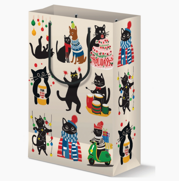 This bag was constructed using heavyweight card stock and printed in full color with patterns that go around all sides of the bag. The base is reinforced with an additional piece of glued in cardboard to add strength and stability.