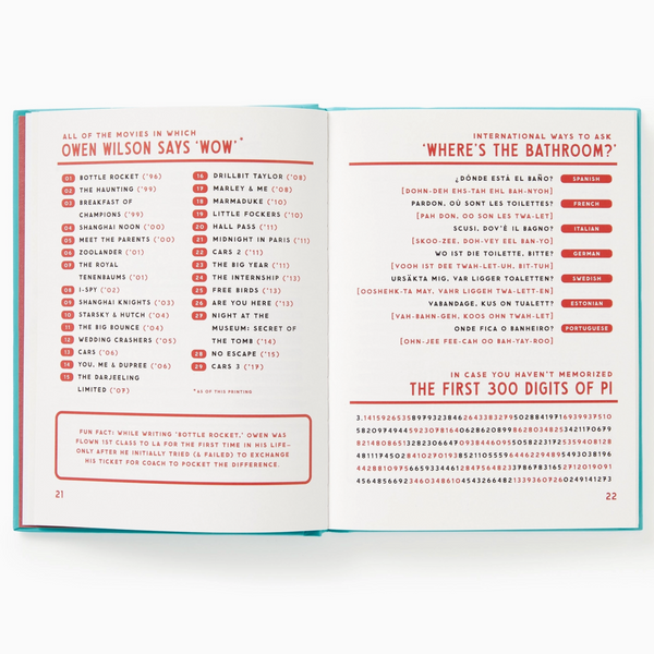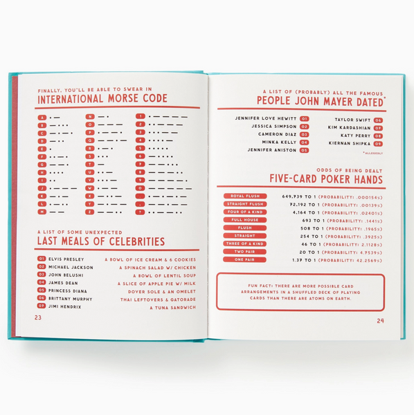 Inside you'll find a comprehensive 160 pages, filled with all sorts of lists, charts and fun facts. This indispensable compendium of weirdly entertaining info will fill your brain with the stuff they didn't teach you in school, mainly because they'd have lost their accreditation if they did.