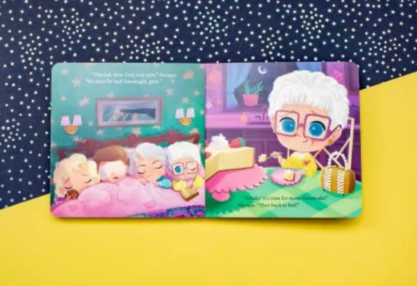 Dorothy, Blanche, and Rose are having a sleepover! And, of course, they are having too much fun to go to sleep. As Ma tries to get them to settle down, the girls enjoy some cheesecake in the kitchen, try on their dress-up clothes, sing and dance, and say goodnight to their friends Stan and Miles. Finally, after taking a bath and putting on their pj's, they all squeeze into bed and listen to one of Ma's Sicily stories before they drift off together.