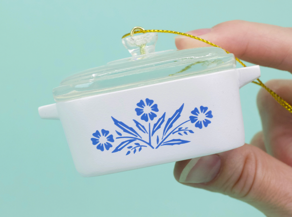 Celebrate one of the most beloved retro kitchen dishes in miniature form with this Corning Ware–inspired Cornflower Casserole Ornament. Hand-cast in resin with a smooth finish, this tiny casserole captures the charm of the iconic blue Cornflower design, with a clear resin lid that looks just like glass. A nod to the classic dishes that saw generations of potlucks, family dinners, and weeknight casseroles, it’s a small keepsake packed with big nostalgia.
