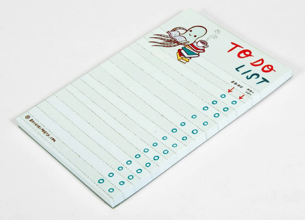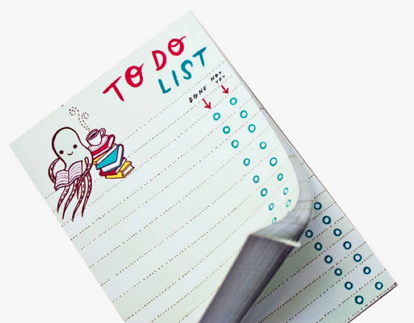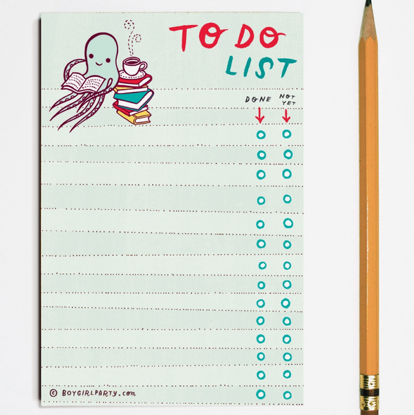 This 50-page, recycled paper to-do list notepad features an original illustration of an octopus reading while drinking a hot beverage.
