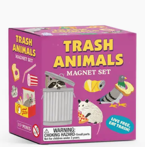 - Interactive Magnet Set: Includes a double-sided illustrated back drop and 25 magnets of raccoons, possums, pigeons, and other cute trash animals to create your own scenes.