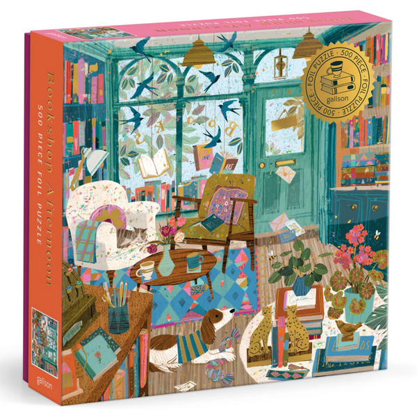 Victoria Ball's Bookshop Afternoon 500 Piece Foil Puzzle invites literary enthusiasts into a tranquil bibliophile's haven.