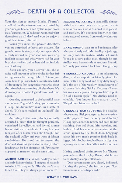 The Story: Reginald Audley, renowned collector of antiques and oddities, has been murdered! Only the great detective Medea Thorne can find the killer.