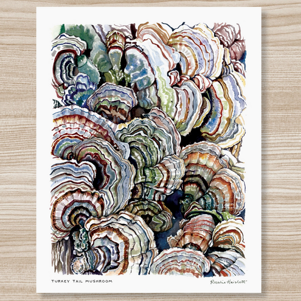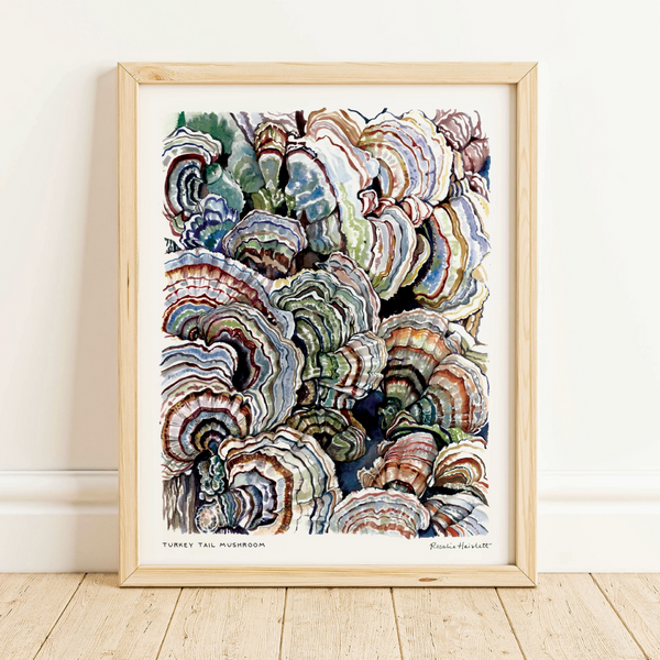 This original art print features my watercolor interpretation of a vibrant, detailed turkey tail mushroom that was growing on a fallen log along a trail near my home in West Virginia.