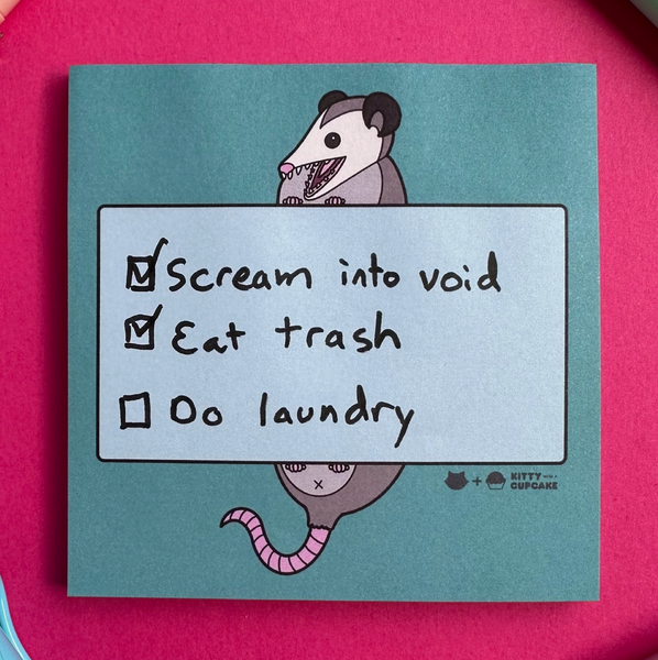An opossum who just wants to help you get stuff done by hanging out on your sticky notes!