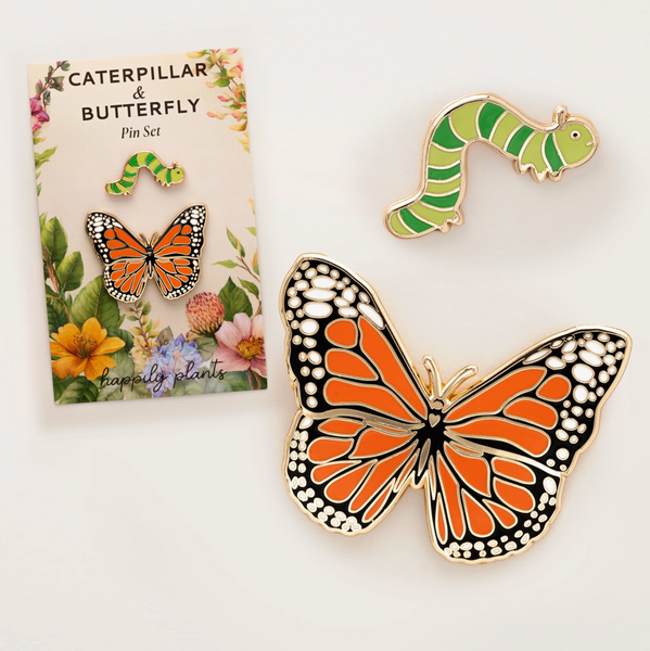 Set of 2 pinsDimensions: Butterfly - 1.75" x 1.25"Caterpillar - 1.125" x .5"